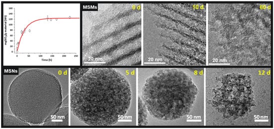 Top left corner: Silica dissolution profile of pure MSMs in physiological medium (Phosphate Buffer Solution, PBS); top right corner: transmission electron microscopy images of the degradation process of MSMs in PBS at different time points; Bottom: transmission electron microscopy images of the degradation of MSNs in PBS at different time points. Adapted with the permission from [], published by Springer Nature, 2017.