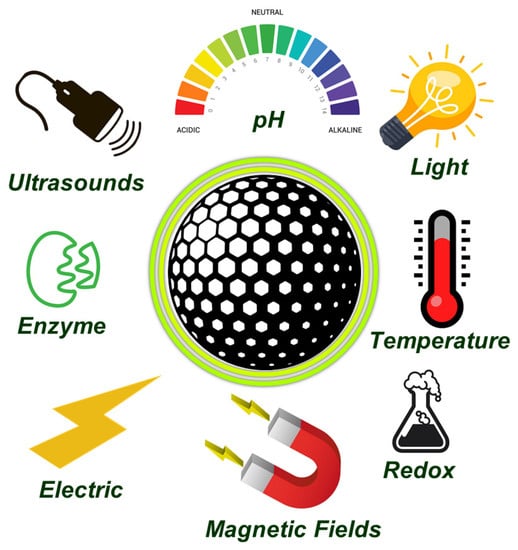 The team of Prof Vallet-Regí has spent most of the last 10 years developing on demand nanosystems employing MSNs, which can be approached from different perspectives, such as grafting sensitive gates to the pore entrances or nanoparticle coating with detachable shells [,,,,]. Then, the pore entrances could be opened under the operation of certain stimuli, that can be internal or external. The former stimuli are typical from the treated pathology where certain relevant biomarkers might be overexpressed or downregulated, including pH, redox potential and enzymes, among others. On the other hand, external stimuli can be remotely applied, and include magnetic fields, ultrasounds, electrical fields or light (Figure 3).