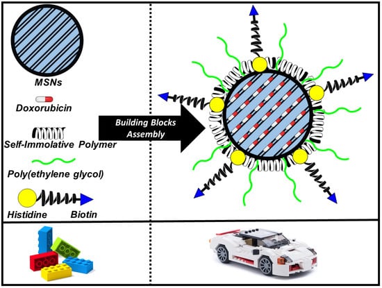 Schematic representation of the building blocks assemble for developing a stimuli-responsive smart nanocarrier. MSNs: nanocarrier platform; Doxorubicin: cytotoxic drug; self-immolative polymer: redox-responsive polymer; poly(ethylene) glycol: stabilising agent in physiological media; Histidine: endosomal escape; Biotin: active targeting agent.