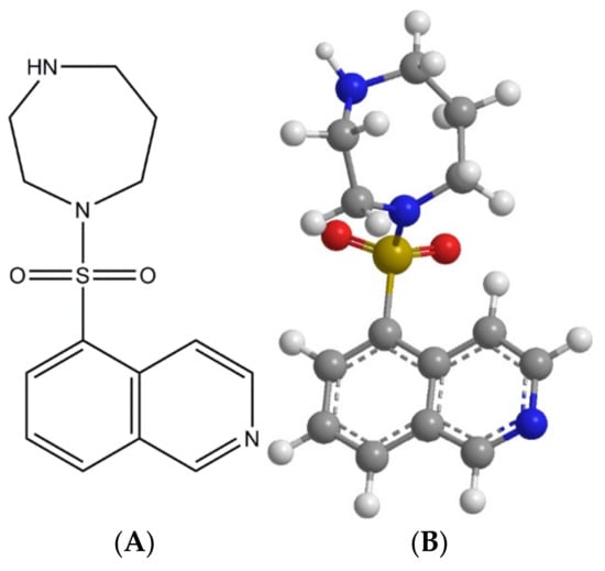 Structures of Fasudil (ChemDraw® Ultra Ver. 10.0.; CambridgeSoft, Cambridge, MA, USA): (A). Chemical structure; and (B). ball-n-stick 3-D model.