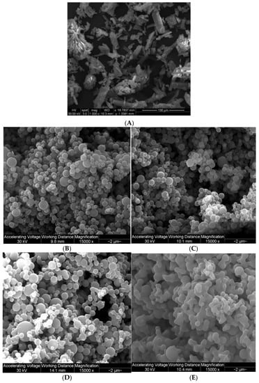 The mean size, standard deviation and size range of the particles were determined digitally using Sigma Scan Pro 5.0.0 (Systat, San Jose, CA, USA), using similar conditions that have been previously reported [,,]. Representative micrographs for each particle sample at 15,000× magnification was analyzed by measuring the diameter of at least 100 particles per sample.