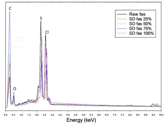 EDX atomic composition spectra of raw FAS and SD FAS showing characteristic peaks for carbon (C), oxygen (O), sulfur (S), and chlorine (Cl) atoms.