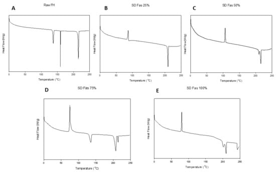DSC thermograms of Fasudil: (A). Raw FAS; (B). SD FAS 25% pump rate; (C). SD FAS 50% pump rate; (D). SD FAS 75% pump rate; and (E). SD FAS 100% pump rate. (Exotherm: upward and Endotherm: downward).