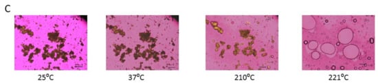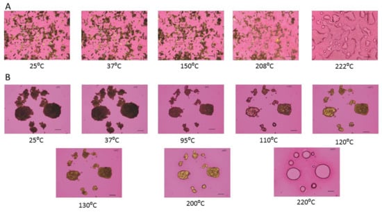 SD FAS (25%) birefringence remained unchanged until 95 °C (Figure 6). After that a change in particle size similar to particle shrinkage was seen followed by the appearance of birefringence around 110 °C, then change in birefringence around 120 ° and 130 °C and finally melting above 200 °C. Similarly, SD FAS 50% PR and SD FAS 75% PR showed particle shrinkage and several changes in birefringence after 93 °C and 43 °C, respectively, before they melted above 200 °C (data not shown). SD FAS at 100% showed no changes in birefringence until 210 °C until it started to melt.