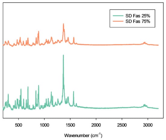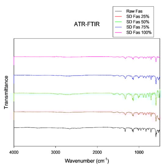 Assigning groups to every peak in IR spectrum is difficult since there were many overlapping bands. However, some characteristic peaks of FAS were identified in the ATR-FTIR spectrum in Figure 8 at approximately 1159 cm−1 (SO2 symmetric stretching) low energy for symmetric stretch and slightly more energy for an anti-symmetric stretch at 1332 cm−1 (SO2 antisymmetric stretch) characteristics of sulfonamide group. The slight peak seen around 1620 cm−1 (stretching of aromatic ring) is indicative of isoquinoline. These are similar to previous reports of FAS hemihydrates []. The spectral pattern seen at fingerprint region (<1500 wavenumber) was consistently observed in all SD FAS and raw FAS samples where the peaks were found at ~710 cm−1, 836 cm−1, 892 cm−1, 1012 cm−1, 1136 cm−1, and 1325 cm−1.