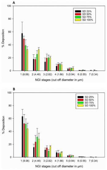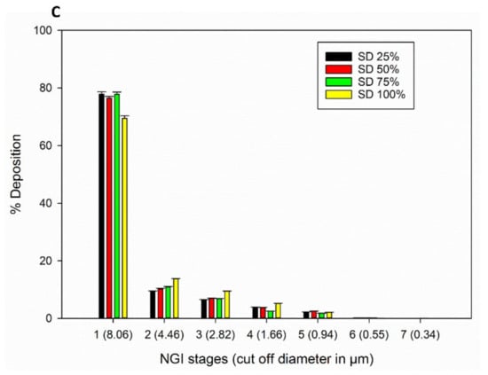 In vitro aerosol dispersion performance was conducted in accordance to USP Chapter <601> specifications [] using conditions similar to those previously reported [,,,], the aerosol dispersion performance of spray dried particles was tested using the Next Generation Impactor™ (NGI™) (MSP Corporation, Shoreview, MN, USA) connected to a stainless steel induction port (USP throat) and a mouthpiece adaptor. The flow rate (Q) of 60 L/min using a Copley DFM 2000 digital flow meter (Copley Scientific, Nottingham, UK) and high-capacity oil-free vacuum pump (Copley Scientific, Nottingham, UK). Three FDA-approved human DPI devices Aerolizer® (Merck, Kenilworth, NJ, USA), Neohaler® (Novartis, Basel, Switzerland) and HandiHaler® (Boehringer Ingelheim, Germany) were used and these are all unit-dose capsule-based DPI devices. Quali-V-I clear HPMC size 3 inhalation grade capsules (Qualicaps, Whitsett, NC, USA) were filled with about 10 mg of powder. The aerosol dispersion performance was measured gravimetrically using NGI gravimetric collection cups (MSP Corporation, Shoreview, MN, USA) containing type A/E glass fiber filters with diameter 75 mm (Advantec, Japan) and diameter 55 mm (PALL Corporation, Port Washington, NY, USA), similar to our previous reports (30–33). Three capsules were used per experiment. All experiments were triplicated (n = 3) at ambient temperature and humidity. The ED (%) Equation (1) was used to express the percentage of ED based on the total dose (TD) used. The fine particle dose (FPD) was defined as the dose deposited on Stages 2 to 7. The fine particle fraction (FPF%) Equation (2) was expressed as the percentage of FPD to ED. The respirable fraction (RF%) Equation (3) was used as the percentage of FPD to total deposited dose (DD) on all impactor stages.