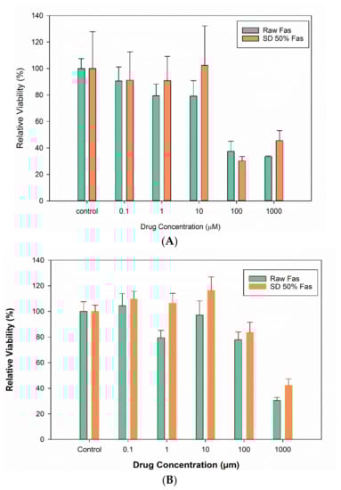 The effect of the drug formulations on the human pulmonary cell lines A549, a human alveolar epithelial lung adenocarcinoma, and H358, an alveolar type II pneumocyte were studied as described [,,]. Both cell lines were grown in Dulbecco’s modified Eagle’s medium (DMEM) advanced 1×, 10% (v/v) growth medium including fetal bovine serum (FBS), Pen-Strep (100 U/mL penicillin, 100 µg/mL), Fungizone (0.5 µg/mL amphotericin B, 0.41 µg/mL sodium deoxycholate), and 2 mM L-Glutamine in a humidified incubator at 37 °C and 5% CO2. The cells were exposed to 100 µL of FAS dissolved in media at different concentrations then incubated for 72 h. A volume of 20 µL of 10 µM resazurin sodium salt was added to each well and the fluorescence intensity was detected after 4 h at 544 nm (excitation) and 590 nm (emission). The relative viability of each sample was calculated as follow:
