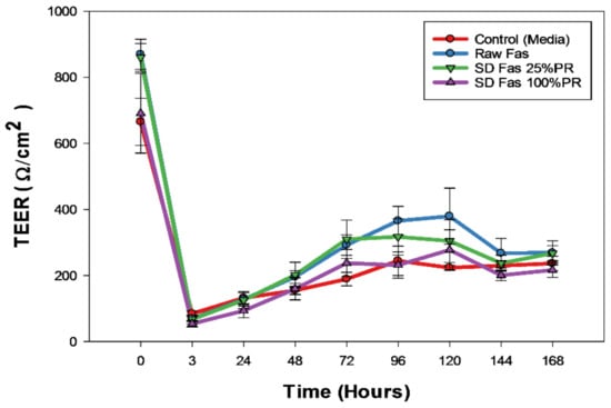 Calu-3 cells, a human lung epithelial cell line, were grown in Eagle’s minimum essential medium (EMEM) growth media with 10% (v/v) fetal bovine serum (FBS), Pen-Strep (100 U/mL penicillin, 100 µg/mL), Fungizone (0.5 µg/mL amphotericin B, 0.41 µg/mL sodium deoxycholate) as previously reported [,]. The cell seeding and growth were performed similar to previous conditions [,]. After 10 days of growth, when the cells reached a TEER value of ~1000 Ω/cm2 air-interface culture (AIC) conditions were induced by removing media from the apical side and adding 800 μL of media to the basolateral side of the Transwell. The TEER value was measured with an Endohom 12 mm Culture Cup (World precision instruments, Sarasota, FL, USA) where 0.5 mL of media was added to the apical side only for the measurements after which the cells returned to AIC. Once the TEER values reached 500 Ω/cm2 in AIC conditions, the cells were exposed to 100 µM of raw Fasudil and SD FAS formulations, delivered using the MicroSprayer® Aerolizer (Penn-Century Inc, Wyndmoor, PA, USA), dissolved in non-supplemented EMEM media. TEER values were then recorded for up to 7 days after aerosol treatment, as previously reported [,,].