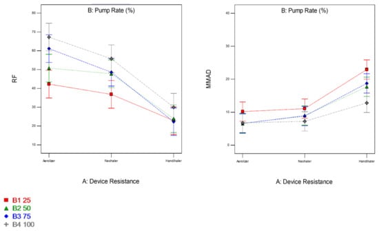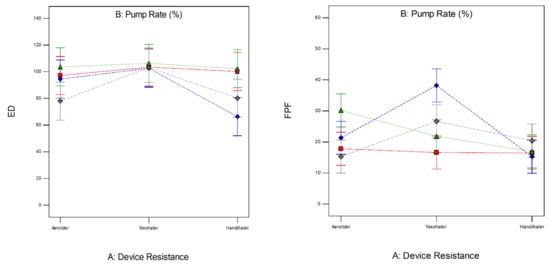 Design of experiments (DOEs) interaction plots (Design Expert® 8.0.7.1 software, Stat-Ease Corporation, Minneapolis, MN, USA) of spray drying pump rate and inhaler device resistance on in vitro aerosol performance parameters for all 4 SD FAS dry powders (25% PR, 50% PR, 75% PR, and 100% PR).