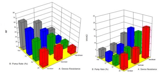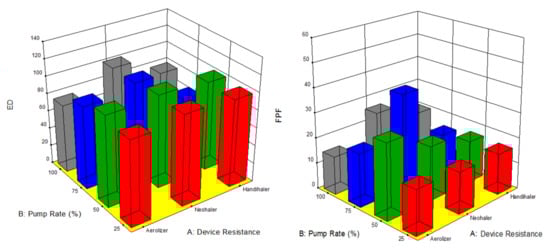 The factors interaction plots shown in Figure 12 and surface 3-D plots shown in Figure 13 reveal the interaction of spray drying pump rate and the DPI device shear stress factors on influencing aerosol dispersion of SD FAS particles. All of the SD FAS nanoparticulate/microparticulate powders produced at different spray drying pump rates had the same or lower FPF values when aerosolized using the HandiHaler® DPI device. However, the FPF value is increased for some pump rates with low resistance device while for the other pump rates with medium resistance device. This explains that the de-aggregation of the particles depends on the combination of formulation and the device properties. The RF of all the SD FAS particles decreased with high resistance inhaler, suggesting insufficient detachment of the primary particles. One-way ANOVA statistical analyses indicated that the device resistance and pump rate had statistically significant effects on the aerosol dispersion performance parameters. This predictive model serves as a pre-screening tool to rationally select and optimally match of the SD FAS formulation with a human DPI device to achieve superior aerosol performance. For example, 75% SD FAS performs better with Neohaler®, while 25% SD FAS performs well with Aerolizer®.