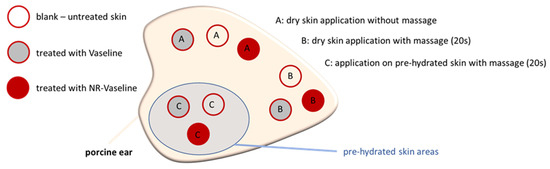 The dermal penetration efficacy was determined on the ex vivo porcine ear model. The model uses non-modified skin that is still in its original physiological condition, i.e., it is still connected to the cartilage and thus remains in its original skin tension without any manipulation. Therefore, the model is considered as able to provide highly sensitive and sensible penetration data with high ex vivo/in vivo correlation [6,7,8,9]. For the experiments, fresh porcine ears were obtained from a local slaughterhouse and were used for the tests within 6 h after the slaughter. Prior to the tests, the ears were washed with lukewarm water and dabbed dry with paper towels. Intact skin areas without visible scratches or wounds were selected and marked. Hair within these areas was cut short (1–3 mm) and the integrity of the skin was ensured by assessing the transepidermal water loss (TEWL) within these areas with a Tewameter® TM 300 (Courage + Khazaka electronic GmbH, Köln, Germany). Skin areas with TEWL values > 12 g/m2/h were considered to possess a disrupted skin barrier and were excluded from the study. Hydration of the skin was performed by placing a water-soaked paper tissue on top of the selected skin areas for 15 min. After 15 min, the tissue was removed and water on the skin surface was carefully dabbed off with a dry paper tissue. V-NR was applied in infinite dose setup (>10 mg/cm2) onto dry skin with and without massage (finger massage with saturated glove for 20 s) and onto the pre-hydrated skin with massage (Figure 1).