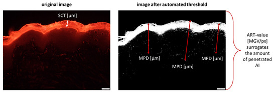 The images obtained from epifluorescence microscopy were subjected to digital image analysis using ImageJ software [14,15,16]. The penetration efficacy was determined by assessing the amount of penetrated Nile red (AP-NR) semi-quantitatively and its mean penetration depth (MPD) into the skin by using a previously established protocol [17]. In addition, the stratum corneum thickness (SCT) was measured as a surrogate for skin hydration [6,7]. The AP and MPD were determined from the original images that were subjected to an automated RGB-threshold algorithm (Supplementary Materials S1) to subtract the autofluorescence of the skin (background, class II pixels) from the images [17]. The remaining light intensities in the images (foreground, class I pixels) correspond to the autofluorescence of the images after the RGB threshold (ART) and thus, were used as a semi-quantitative surrogate parameter to estimate the amount of penetrated AI surrogate [17]. The ART values were assessed as mean grey value per pixel (MGV/px) from each image [8,9,17]. The MPD was directly measured with the scale function of the software. The scale was set to correspond to 2.84 pixel/µm. Similar to the MPD, the SCT was assessed from the original images (Figure 2).