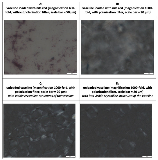 After loading, a homogenously red-colored semi-solid formulation was obtained. However, light microscopy showed that NR was not completely dissolved in the Vaseline, i.e., Nile red crystals were clearly detectable within the formulation (Figure 3A). Interestingly, it was observed that all the images obtained, especially the larger magnifications, appeared rather blurred and not sharp (Figure 3). Images with a polarization filter showed crystalline structures for both the loaded and unloaded Vaseline (Figure 3B–D). Hence, images confirm the presence of a three-dimensional crystalline network that consists of fiber-like crystals that immobilize the liquid hydrocarbons (Figure 3B,C). However, in some images, the crystalline structures appeared rather disperse and not connected to each other (Figure 3D). This might suggest that the Vaseline was also in the newly suggested structure by van Heugthen et al., i.e., where crystals form a network of lamellar stacks that trap the liquid fraction of petrolatum [20].