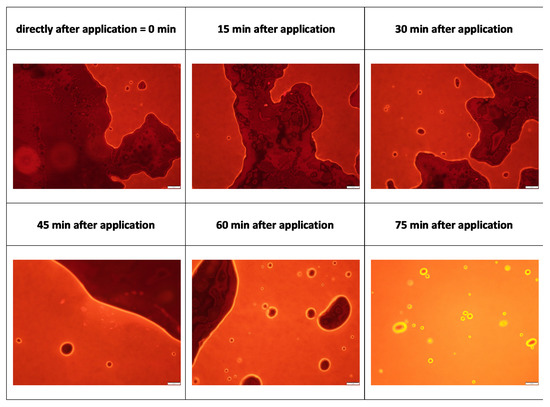 The microscopic analysis of the formulations with inverted epifluorescence microscopy revealed images that showed the appearance of a liquid film that enlarged over time (Figure 4). The inverted setup of the microscope allows for the observation of samples from the frog’s perspective, i.e., from underneath. Thus, the microscope slide acts as a surrogate for the skin and the images taken therefore show how a formulation behaves on the microscopic slide, i.e., the skin surrogate. In this light, one can see that Vaseline undergoes synereses, also known as “oil bleeding”, upon application onto the skin. This means that upon application onto the skin, the liquid hydrocarbons of the Vaseline were released from the crystalline network of the solid hydrocarbons and formed a film on top of the microscopic slight and/or the skin. The formation of the liquid film can also explain the blurred images obtained from light microscopy (Figure 3), because such a liquid film shifts the crystalline structures out of the focus of the lens, thus making the acquisition of sharp images difficult. To the best of our knowledge, the occurrence of syneresis after topical application of Vaseline on skin has not yet been described in the literature. However, the findings can be regarded as being of high relevance since the mineral oil film that is formed between Vaseline and the skin might affect various other parameters that are important for the dermal penetration of active compounds. This includes, for example, drug localization, drug diffusion and flux, concentration gradient of drug between vehicle and skin, etc. In addition, also the skin properties (for example, skin hydration or occlusive properties) might be influenced by this local syneresis effect.