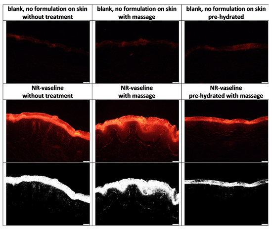 Images obtained from epifluorescence microscopy of the skin sections without Vaseline treatment (blank) and of the skin sections treated with Vaseline loaded with Nile red (middle row—original images, lower row—images after automated RGB Threshold). Scale bare = 50 µm.