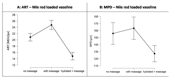 Dermal penetration efficacy of Nile red when loaded into Vaseline and applied onto skin without massage, with massage, and with massage on pre-hydrated skin. (A) ART-value (ART, MGV/px), a semi-quantitative parameter that estimates the amount of penetrated NR; (B) Mean penetration depth (MPD, µm).