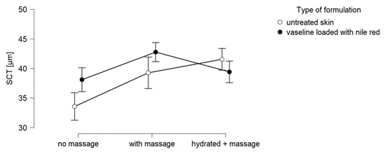 The SCT of blank skin possessed a thickness of 34 µm (Figure 7). Massage of untreated skin increased the SCT significantly by 17%, and skin hydration caused an increase in SCT by 24%. The hydration of skin was expected to cause a swelling of the SC because it can be expected that the water penetrates into the SC. However, massage was not expected to cause any effect on the SCT. Nonetheless, the observed effect was significant (p < 0.01) and might therefore indicate that massage is also able to cause a deposition of water into the SC.