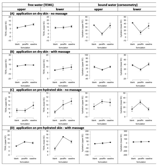 The water content (free and bound water) of the skin surface and in the deeper layers of the SC was determined with TEWL and corneometer measurements. The Tewameter measures the amount of evaporating water from the skin per time and thus represents the amount of free and unbound water on or in the skin. Corneometry measures the capacitance of the surface and thus represents the water bound in the tissue. Measurements were taken from the upper surface and after tape stripping. With this, the water content (bound and unbound) was determined for the skin surface (upper) and for the deeper layers of the stratum corneum (lower). The influence of skin hydration and massage was tested by applying the formulations onto dry skin without (A) or with massage (B) or on pre-hydrated skin without (C) and with massage (D). The skin was treated with Vaseline or mineral oil (paraffin), while non-treated skin (no applied formulation) served as control. Data obtained are summarized in Figure 8 and Table 1.
