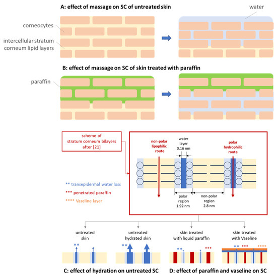 The treatment of wet skin with Vaseline resulted in a tremendous increase in the free water on top of the skin (+92%) when compared to untreated skin. When compared to the dry skin treated with Vaseline without massage, the effect was smaller (+13%). The free water in the lower SC was not affected and the content of bound water was decreased (approx. −40%). Hence, Vaseline could prevent the dehydration of the hydrated skin without treatment but could not increase the skin hydration as efficient as the paraffin. Data therefore suggest that the skin hydrating mechanism of paraffin is different to the mechanism of Vaseline. Maybe it can be assumed that the paraffin remains not totally on top of the skin but penetrates—at least in parts—within the non-polar regions of the intercellular stratum corneum lipid bilayers. The localization of the paraffin in the hydrophobic regions can then be considered to cause a swelling of the hydrophobic pathway whilst reducing the thickness of the hydrophilic regions. This reduces the “water pores” in the SC and leads to a decreased evaporation of water from the skin, thus, reducing the dehydration of the skin (Figure 9D).