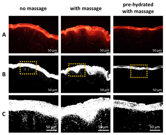 Influence of application, formulations, and skin condition on skin hydration and penetration efficacy of Nile red. (A): original images of skin sections obtained from epifluorescence microscopy, (B): images from (A) after digital RGB-threshold, (C): digital zooms of the dashed image sections from (B).