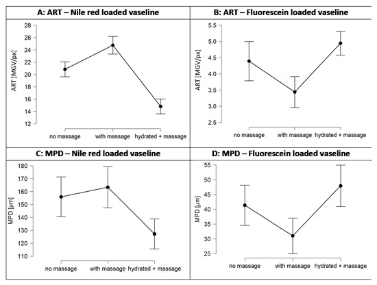 The penetration efficacy was estimated from the visual inspection of the images obtained from epifluorescence microscopy (Figure 5) and by assessing the ART-value and the MPD (Figure 6). The images obtained from epifluorescence microscopy showed tremendous differences in the dermal penetration efficacy of Nile red on the differently treated skin areas. Application of the Nile red-loaded Vaseline on dry skin without massage allowed the Nile red to penetrate into the stratum corneum and to some extent into the epidermis and the viable dermis. Massage increased the ART value significantly by 19%, and the MPD was increased by 5% (p > 0.05). In contrast, application with massage on the hydrated skin decreased the ART value by 29% and the MPD by 18%. Both effects were significant (p < 0.001). The increased penetration efficacy of massage was expected. However, the decreased penetration efficacy that was observed when the formulation was applied onto pre-hydrated skin was not expected, because it was initially aimed at yielding a superposition by combining the three different skin penetration enhancing effects, i.e., occlusion, massage, and direct-skin hydration in one treatment.