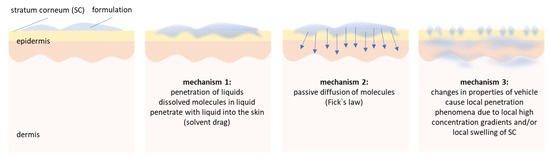 Proposed mechanisms of dermal penetration. 1st mechanism: penetration of low viscous liquids—active compounds penetrate via convection (solvent drag mechanisms) into the skin. 2nd mechanism: vehicle and skin are in equilibrium—AI penetrate via passive diffusion, 3rd mechanism: transformation of vehicle creates passive penetration phenomena—one example is the particle assisted penetration enhancement, i.e., the formation of aqueous menisci below particulate materials that increase the penetration of AI being dissolved in the liquid of the menisci [6]. It is likely that the different mechanisms occur not step-wise but superimpose each other.