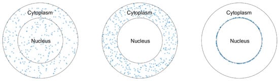 We studied three human cancer cell lines—Hela, SQ20B and A549—with existing experimental data. Simplified models with spherical cell and nucleus volumes were used for all the cells. The typical radii of a SQ20B cell and its nucleus are approximately 10.6 μm and 8.1 μm, respectively [], and the corresponding values for a Hela cell are 8.6 μm [] and 5.5 μm [], respectively. The typical volumes of a A549 cell and its nucleus are approximately 1670 μm3 and 466 μm3, respectively []. Therefore, a nucleus radius of 4.8 μm and a cell radius of 7.4 μm were used for the A549 cell. To quantify NP radiosensitization, three scenarios of NP distribution in the cell were considered (Figure 1) (a) uniformly distributed throughout the entire cell, (b) uniformly distributed in the cytoplasm only, and (c) uniformly distributed around the nuclear membrane. The third scenario was simulated because some researchers found that NPs were located around the nuclei [,]. As we only focused on the local radiation effects of NPs, the effect of NPs outside the cell was not considered.