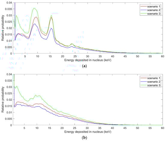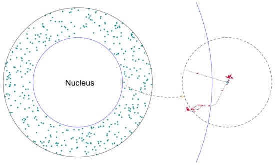 The Auger electron cascade has been considered to have similar behavior to high linear energy transfer (LET) radiation (2–25 keV/μm), inducing high cytotoxicity if the electron source is located in close proximity to the nuclear DNA [,,,]. Most Auger electrons deposit their energy within 500 nm []. In an Auger electron cascade, usually more than one Auger electron is emitted together with the relatively high energy photoelectron. Given their range and temporal and spatial correlation, it is expected that the distribution of distances between energy deposition locations of the electrons will play an important role in the pairwise combination of double-strand breaks (DSBs) caused by these electrons to produce a lethal event (some types of chromosome aberrations) because the spatial proximity of energy transfers governs the combination probability [].
