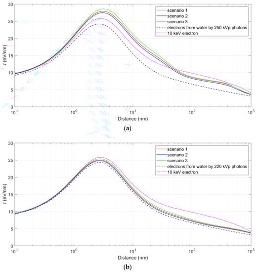 Goodhead et al. [] suggested that the biological effect of low-LET radiation was predominantly due to its track-end clustered ionizations, and Nikjoo et al. [] suggested that for electron and photon irradiation, clusters of energy depositions are mainly due to low energy track-ends, and nearly 20–30% of the DSBs are complex (additional breaks within the range of 10 bp) for these low energy electrons (100 eV to ~5 keV). The RBE of many endpoints due to the track-ends would therefore be higher than that of far more sparse ionizations. Nonetheless, as the proximity function at short distances reflects clustering of energy transfers [], the small difference (<25%) in the proximity function values around or less than 1 nm between the secondary electrons with NPs and without NPs implies that the RBE due to the NPs is not large. Therefore, the general conclusion of our microdosimetric investigation could remain unchanged if complex types of DNA lesions produced by multiple track ends are considered. The issue of complex types of DNA lesions has been discussed in our previous work [].