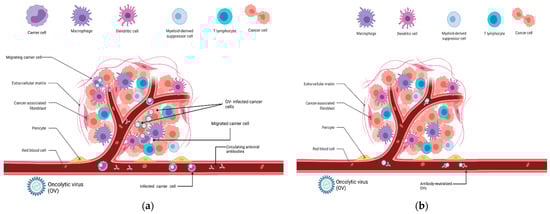 Bioavailability of an oncolytic virus to the tumor microenvironment following intravenous injection in the presence of pre-existing antibodies: (a) OV-infected carrier cells migrate into the TME, where they release viral particles, even in the presence of antiviral antibodies in the bloodstream; (b) cell-free virions in the bloodstream are neutralized by antibodies and cannot infect cancer cells.