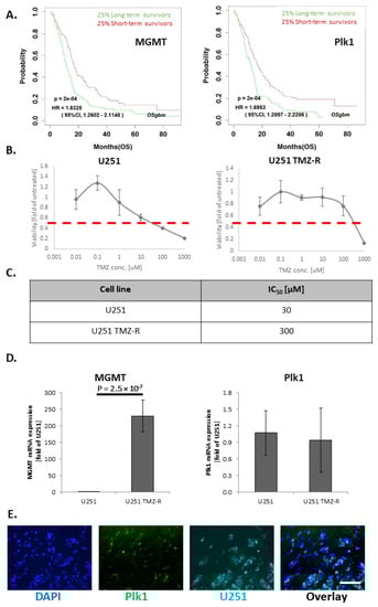 The development of resistance to TMZ enhances MGMT expression without altering Plk1 oncogene levels in GB. (A) Survival analysis performed on OSgbm database comparing MGMT expression (left panel) and Plk1 expression (right panel) of the top 25% longest GB survivors versus the bottom 25% shortest survivors. (B) Inhibitory concentration 50% (IC50) plot of parental U251 glioblastoma cells vs. TMZR clone. (C) Table summarizing the IC50 of wild-type U251 cells versus U251 TMZ-R cells. (D) TMZ resistance in U251 occurred via upregulation of MGMT, without changing Plk1 levels. (E) Intracranial U251 GB tumors show Plk1 expression (scale = 100 µm).