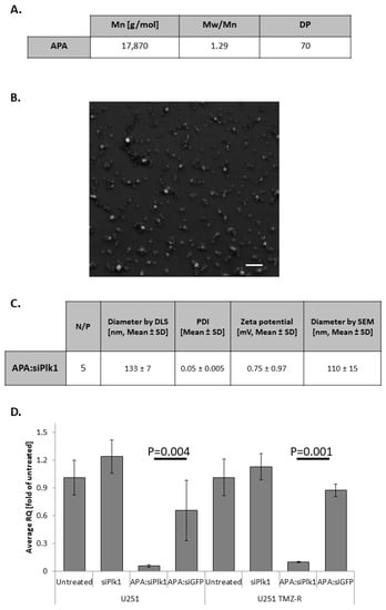 Physico-chemical characteristics and silencing activity of APA:siPlk1 polyplexes. (A) Table summarizing the Mw (Mn), PDI (Mw/Mn), and theoretical degree of polymerization (DP) as obtained by multi-angle light scattering (MALS). (B) Scanning electron microscope (SEM) image of the dry droplet of polyplexes (scale = 500 nm). (C) Table summarizing the hydrodynamic diameter, polydispersity index (PDI) and zeta potential of the main population of polyplexes, obtained by Mobius and PALS instruments, and the average diameter obtained by SEM. (D) Specific mRNA silencing obtained by RT-PCR, performed on U251 and U251 TMZ-R GB cells following treatment with APA:siPlk1 polyplexes.