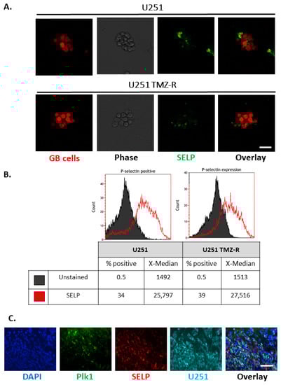 SELP expression on U251 and U251 TMZ-R 3D spheroids. (A) Imaged by confocal microscopy (scale = 20 µm) and (B) analyzed by fluorescence activated cell sorting (FACS). (C) SELP expression on slices of U251 intracranial tumors and co-localization with Plk1 (scale = 100 µm).