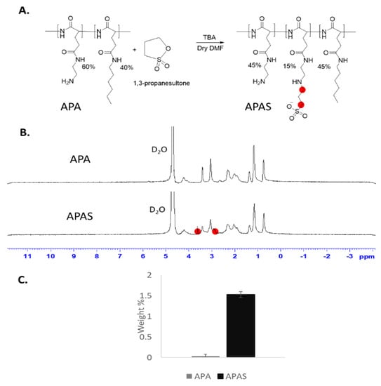 Synthesis and characterization of APAS. (A) Modification of APA with sulfonate groups using propanesultone. (B) 1H-NMR spectrum of APA and APAS in D2O. (C) Elemental analysis demonstrating the weight percent of Sulfur (S) in dry samples of APA and APAS, as obtained by energy-dispersive X-ray spectroscopy (EDS) analysis.