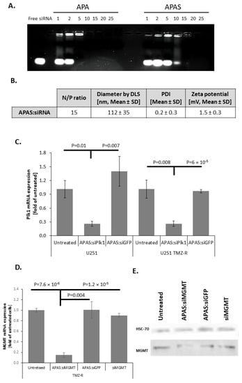 Sulfonate modification maintained size and activity of APA complexes. (A) Electrophoretic shift assay (EMSA) of polyplexes of APA and APAS with siRNA at increasing N/P ratios. (B) Table summarizing the hydrodynamic diameter, polydispersity index (PDI), and zeta potential of the main population of APAS:siPlk1 polyplexes as obtained by Mobius and PALS instruments. (C) Specific Plk1 mRNA silencing obtained by RT-PCR, performed on U251 and U251 TMZ-R GB cells following treatment with APAS:siPlk1 polyplexes. (D,E) Specific MGMT mRNA silencing obtained by RT-PCR (D) and western Blot (E) performed on U251 and U251 TMZ-R GB cells following treatment with APAS:siMGMT polyplexes.