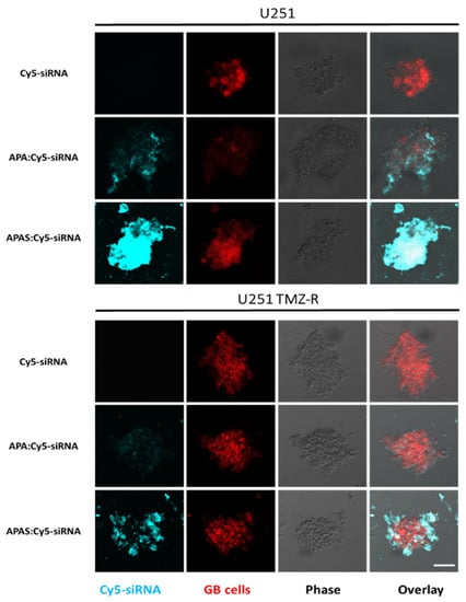 Sulfonate modification of APA facilitated internalization of Cy5-siRNA carrying polyplexes into both U251 and U251 TMZ-R spheroids (scale = 50 µm).
