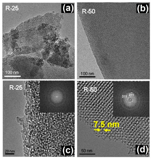 TEM images of RT samples with different surfactant/silica ratio corresponding to R25 (a,c) and R50 (b,d). Adapted with permission from [32]. Copyright 2008 Trans Tech Publications Ltd. (Stafa-Zurich, Switzerland).