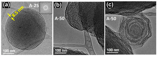 In contrast to the RT samples, the A-A particles exhibited a spherical morphology as observed in Figure 2a. When the surfactant/silica ratio was modified, differences in the microstructure were again found. For A25, two different microstructures coexist in the inner and outside parts. The interior is associated with the original mesoporous structure, which clearly shows a very poor crystalline arrangement. The hexagonal porous arrangement expected from the XRD data, shown in Figure 2 of reference [32], was not visualized, probably due to a partial decomposition under the electron beam. A lamellar arrangement appears in the outer part with a periodicity of 8.5 nm between layers. In the case of A50, two kinds of particles were found, spherical ones (Figure 2b) and others, in a clear process of decomposition, which exhibited a polygonal shape (Figure 2c). This situation derives from the collapse of the lamellar structure after heat treatment, resulting in a poorly ordered arrangement.