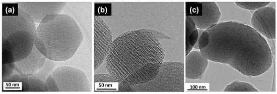 HRTEM images from (a) MSN and amine-functionalized MSN with TEOS:APTES mole ratio (b) 90:10—MSN-10N and (c) 70:30—MSN-30N. Adapted with permission from [43]. Copyright 2018 Elsevier (Amsterdam, The Netherlands).