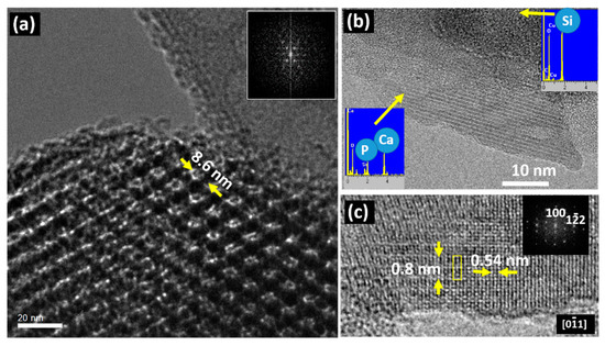 (a) TEM image of SBA-15 before immersion for 60 days in SBF. The corresponding Fast Fourier Transform (FFT) is shown in the inset; (b) TEM image of an acicular particle formed after 60 days in SBF. EDS spectra performed on the particle and the amorphous matrix are shown as insets; (c) HRTEM detail of an acicular particle and its FFT. Adapted with permission from [45]. Copyright 2005 Elsevier (Amsterdam, The Netherlands).