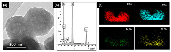 (a) TEM image of Cu-MBG 2%; (b) EDS spectrum of Cu-MBG 2%; and (c) EDS mapping of Cu_MBG 2. Adapted with permission from [53]. Copyright 2017 Elsevier (Amsterdam, The Netherlands).