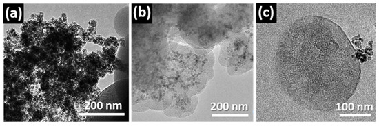 In a similar way, the outstanding textural properties of the mesoporous materials can also be tuned for the design of mesoporous magnetic nanocomposites (MMNs) [11,62], which exhibit enormous potential for biomedical and biotechnological applications such as drug/gene delivery systems [63,64,65], NMR imaging [62], enzyme immobilization [66], cellular uptake [67], and as thermoseeds for cancer treatment by hyperthermia [68,69]. These systems incorporate magnetic nanoparticles inside the mesoporous material, combining their outstanding properties. Different strategies for synthesis have been developed to embed encapsulated nanoparticles into the mesoporous silica matrices [62,70,71]. In these processes, the appropriate surface functionalization is a critical factor for the incorporation of the magnetic nanoparticle. In this context, the preparation of mesoporous silica microspheres based on a sol–gel process in the presence of a cationic structure directing agent [72] combined with three different ferrofluids: (a) pure γ-Fe2O3 without coating; (b) γ-Fe2O3-1 coated with APTEs and (c) γ-Fe2O3-2 coated with silica (Figure 6) was tested in order to obtain MMNs [73]. TEM studies helped to evaluate the effectiveness of the synthetic method. Figure 6c shows TEM images obtained from the three attempts indicating that only γ-Fe2O3-1 nanoparticles were successfully incorporated into the SiO2 mesoporous particles.