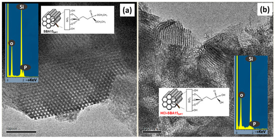 HRTEM images corresponding to (a) SBA15 DPT and (b) HCl-SBA15DPT. The images show a schematic representation of the functionalization and the typical EDS analysis. Adapted with permission from [83]. Copyright 2012 Royal Society of Chemistry (London, UK).