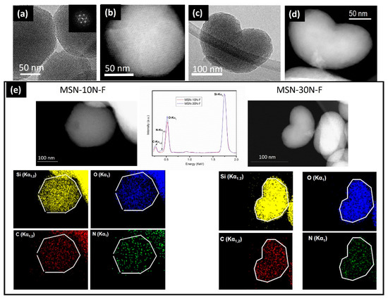 (a,b) Characteristic HRTEM and STEM images corresponding to the MSN-10N-F sample; (c,d) characteristic HRTEM and STEM images corresponding to the MSN-30N-F sample; (e) EDS spectra of MSN-10N-F (left image) and MSN-30N-F (right image) areas and corresponding Si, O, N and C elemental maps (bottom part). Adapted with permission from [43]. Copyright 2018 Elsevier (Amsterdam, The Netherlands).