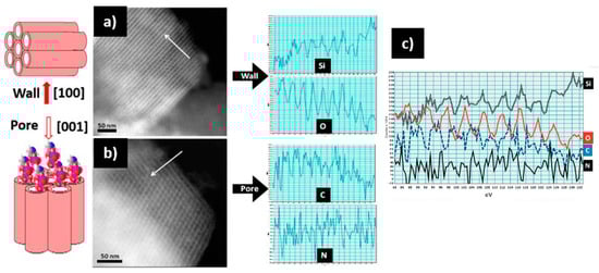 Electron microscopy can go further in the characterization of these systems, proving the presence of drugs in the inner part of the functionalized mesopores by using the STEM-EELS capabilities and employing a spherical aberration (Cs)-corrected microscope. The aberration correction in the STEM mode renders very small probes that provide high sensitivity and high spatial resolution, which offers outstanding analytical capabilities in combination with EELS and EDS spectroscopic techniques. Using this instrumentation, Vallet-Regí and co-workers [84] were able to demonstrate, for the first time, the detection of zolendronate molecules inside the pore channels of an SBA-15 mesoporous matrix. This can be observed in Figure 9, where STEM-HAADF images of this system along the [100] and [001] directions are displayed with the corresponding EELS intensity profiles, evidencing the presence of Si and O across the wall (see Figure 9a) and C and N, which are characteristic of the zolendronate molecules, along the pore direction (see Figure 9b). Along this profile, the Si and O signal appear at the same position (white contrast) alternating with C and N (dark contrast), proving that zolendronate is inside the pore but not in the mesoporous wall (see Figure 9c).