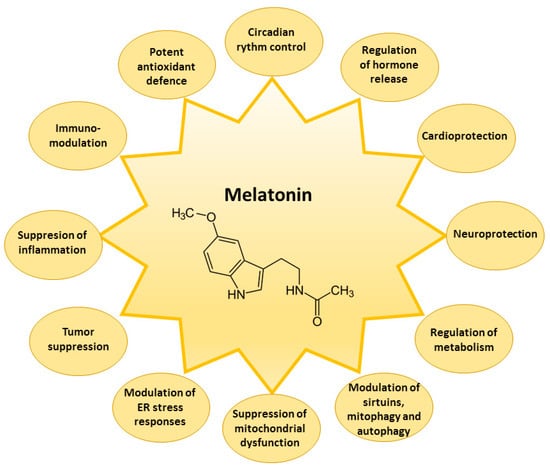 The natural hormone melatonin (N-acetyl-5-methoxytryptamine) can be found in almost all species, such as fungi, plants, and animals [1]. The diet sources rich in melatonin include olives, rice, chamomile, green tea, coffee, tomatoes, and cereals [2,3]. Melatonin modulates many physiological functions, including sleep and circadian rhythm regulation, neuro- and cardioprotection, acting as powerful antioxidant and protecting from lipid peroxidation, inflammation, decreasing tumor growth, inducing apoptosis, and enhancing mitochondrial activity [1,4].