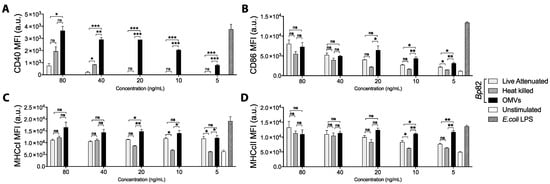 While both OMVs and intact bacteria are clearly recognized and taken up by antigen-presenting cells, they have never been tested head to head for their ability to drive DC activation and maturation—a critical first step in promoting cellular immunity. Here, we examined the relative abilities of OMVs, heat-inactivated, and live-attenuated bacteria to drive DC maturation and activation. For these experiments, we used heat-inactivated and live attenuated Bp82 bacteria, from which the OMVs were derived. As shown in Figure 1, OMVs exhibited a dose-dependent ability to drive DC maturation that significantly exceeded the ability of heat-killed or live strains, and the effect was sustained at OMV concentrations as low as 5 ng/mL (Figure 1A). Expression of co-stimulatory molecule CD86 and major histocompatibility marker class I (MHCcI) increased similarly in response to OMVs and bacteria at high concentrations, yet OMVs induced significantly greater expression of CD86 and MHCcI than the bacteria at lower concentrations (20 ng/mL or less) (Figure 1B,C). The same was true for MHC class II (MHCcII) at concentrations of 10 ng/mL or less (Figure 1D).