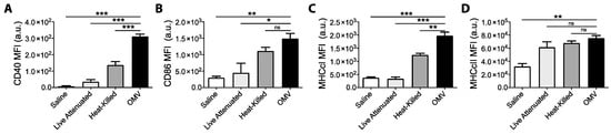 Mice (n = 3) were intra-peritoneally administered either with saline or 10 μg live bacteria, heat-killed bacteria, or OMVs. Peritoneal exudate cells (PerC) were recovered 6 h later by peritoneal washing and stained for viability and surface marker expression, and samples were analyzed by flow cytometry. PerC dendritic cells (DCs) were gated as live (eF780-), Dump- (CD19, B220, CD3, NK1.1) (redFlour710), CD11b+ (BV510), FSc lo, CD11c+ (PE-Cy7), and F4/80- (BV421). Median fluorescence intensity (MFI) for surface marker expression of (A) CD40-PE, (B) CD86-BV605, (C) MHCcI-APC, and (D) MHCcII-PerCP-Cy5.5 were compared between groups. Graphs present MFI data mean + SEM for 3 mice per group. One-way ANOVA with Tukey’s post-test was used to compare variances; ns not significant, * p < 0.05, ** p < 0.01, *** p < 0.001. Results shown are representative of two independent experiments.