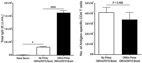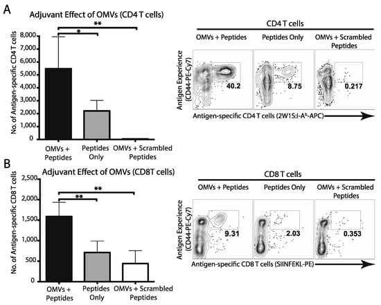 Assessment of Cellular Immune Responses: For measurement of CD4 and CD8 T cells, mice were injected subcutaneously with 200 μg of 2W1S or SIINFEKL peptides, respectively, with or without 1 μg of OMVs. A final group was given 1 μg OMVs plus a scrambled peptide. Fourteen days later, the mice were euthanized, and the draining lymph nodes (axial and inguinal lymph nodes) were collected to assess antigen-specific CD4 and CD8 T cells. Antigen-specific cells were enriched as previously described [24]. Briefly, cells were incubated with 10 nM of I-Ab:2W1S (allophycocyanin conjugated) or H-2Kb:SIINFEKL (phycoerythrin conjugated) tetramer for 1 h at room temperature in the presence of FcBlock. Samples were washed and incubated with Miltenyi (Bergisch Gladbach, Germany) anti-allophycocyanin microbeads, for 2W1S, or anti-phycoerythrin, for SIINFEKL, for 20 min on ice. Resulting samples were washed and passed over Miltenyi LS columns. The enriched, eluted cells were stained for T cell lineage negative markers (ef450; anti-CD19, anti-CD11c, anti-F4/80), anti-CD4 (BV510), anti-CD69 (BVCD69), anti-CD8 (FITC), anti-CD25 (PerCP-Cy5.5), SIINFEKL tetramer (PE), anti-CD44 (PE-Cy7), 2W1S tetramer (APC), and viability (APC-ef780) and analyzed by flow cytometry.