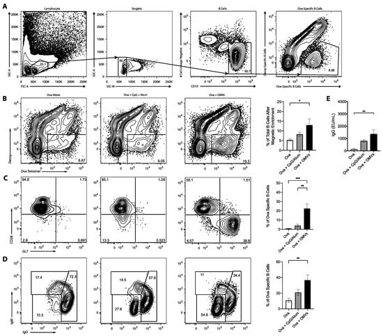 Mice (n = 3) were intramuscularly injected with either 10 μg of Ova alone, 10 μg of Ova plus 10 μg of CpG:alum (1:1), or 10 μg of Ova plus 10 μg of OMVs, and received a booster injections two weeks later. Mice were euthanized one week after the booster injection. (A) Representative gating strategy to show how lymphocytes, singlet, B cells, and Ova-specific B cells were identified. The spleens were harvested and stained with decoy and Ova tetramer (B), CD38 and GL7 to determine germinal center B cells (C), and IgM and IgD to ascertain the amount of isotype switching (D). (E) Ova-specific serum antibodies were detected by ELISAs. Statistics were performed using a one-way ANOVA with a Tukey’s multiple comparison test. *, p < 0.05; **, p < 0.01; ***, p < 0.001. Graphs present the mean + SEM for two independent experiments.